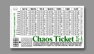 |   Name: Chaos Ticket 35-A The Deed: (none - special Deed used to generate random Bluff Storms) Introduced: Ts35 Printings: Dd003 (1/10/03) Black Envelope Random: 35-A Notes: Random method: red jasper mini polyhedral dice (d8 and d20) rolled in a clear plastic jar (which was destroyed on the inside by the sharp edges of the dice). RETURN TO OBLIVIANA HOMEPAGE © 2003 |