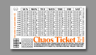 Name: Chaos Ticket 35-D The Deed: (none - special Deed used to generate random Bluff Storms) Introduced: Ts35 Printings: Dd018 (1/13/03) Black Envelope Random: 35-A Notes: Random method: BASIC computer program. Programmed to generate random sets of 84 until the set contains all the Bluff Storms missed by Chaos Tickets A-C. It took over 3000 trials to generate such a set! RETURN TO OBLIVIANA HOMEPAGE © 2003 |