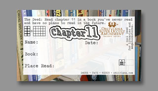 Name: Chapter 11 The Deed: Read chapter 11 in a book you've never read and have no plans to read in the future. Introduced: Ts35 Printings: Dd006 (1/11/03) Black Envelope Random: 35-A Notes: A cool Deed for libraries and megabookstores. RETURN TO OBLIVIANA HOMEPAGE © 2003 |